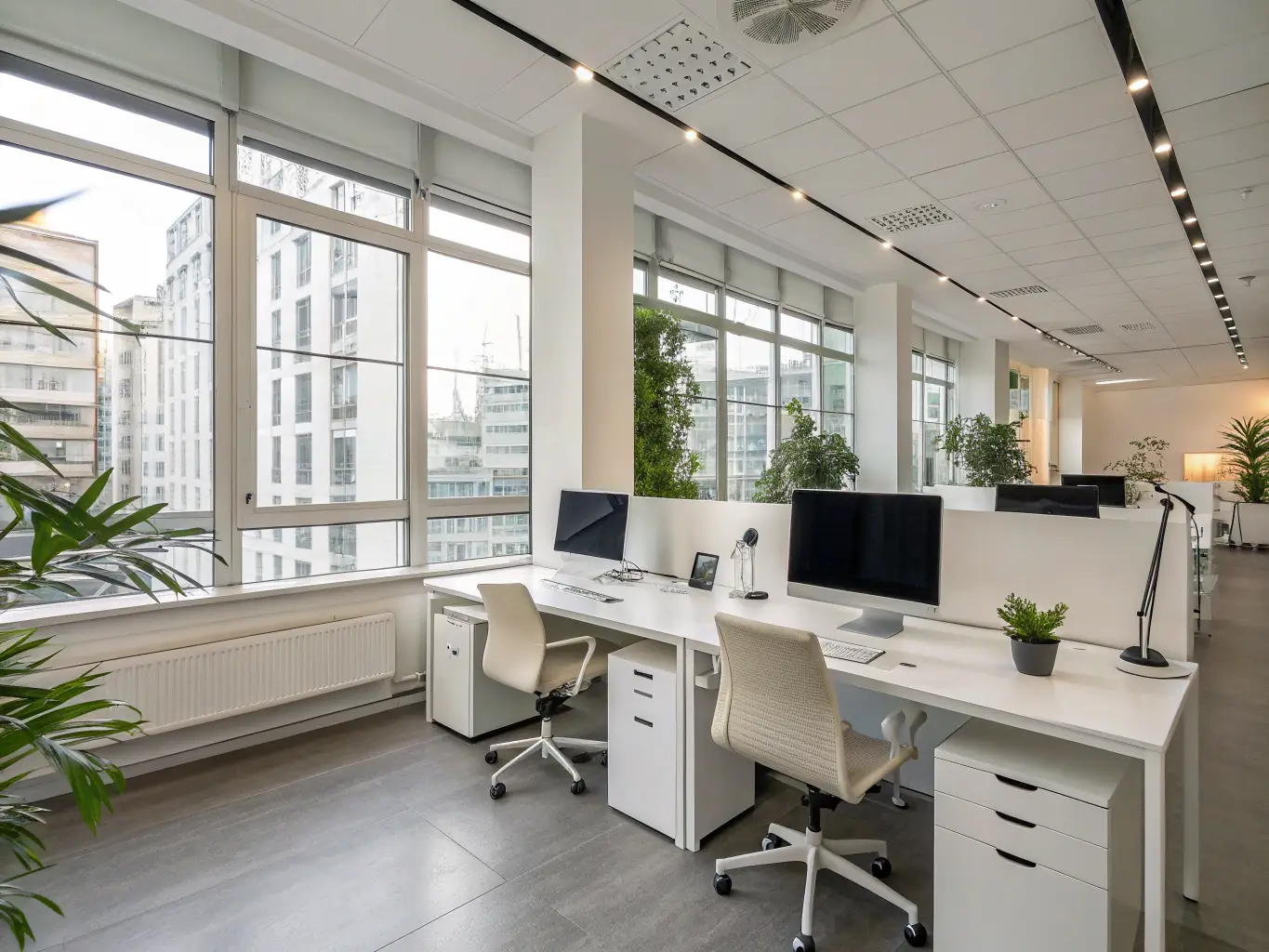 Nowoczesne i funkcjonalne biuro w stylu skandynawskim, z optymalnym wykorzystaniem przestrzeni i naturalnego światła.